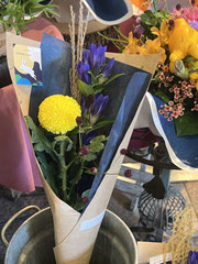 紺の包装紙と黄色の花で夜空と満月を演出、価格もお手頃で夕方には完売していました。