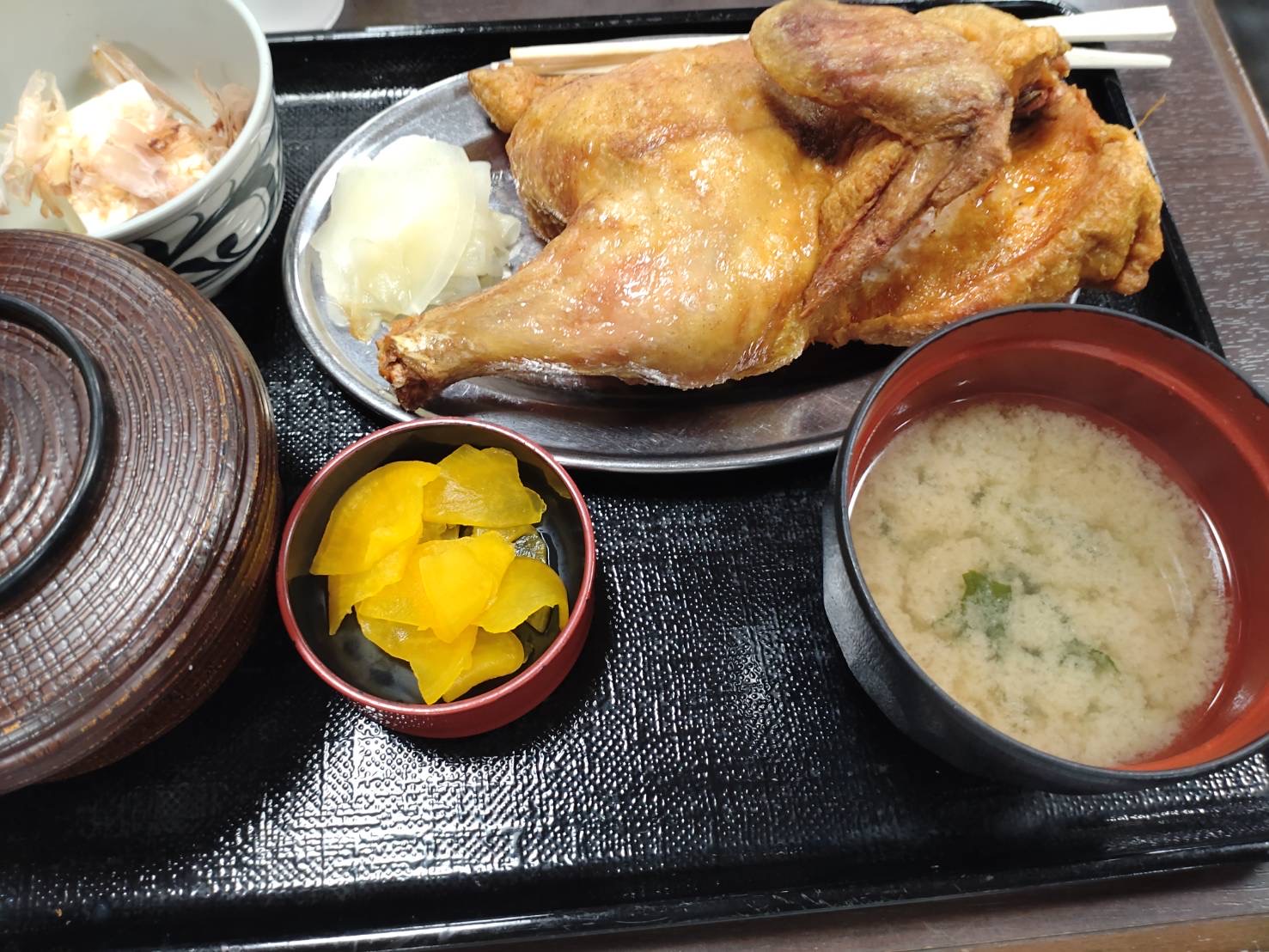 運河を散策し、北海道最古の鉄路手宮線跡を見学後、夕食はなると屋の「半身揚げ定食」を選びました。