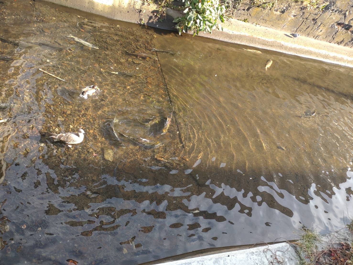 運河の手前の小さな川に人だかりが…なんと鮭が遡上していました。あんなに近くで遡上を見たのは初めてです。最後の力を振り絞り縄張り争いもしていましたよ。